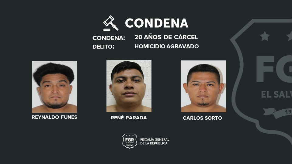 Mientras que Reynaldo Adalberto Funes Beltrán, alias rey, Carlos Ezequiel Sorto, alias Carlos pepe y René Ovidio Parada Aguilar, alias Rene de las flores, fueron sentenciados a 20 años de prisión respectivamente por un homicidio agravado.