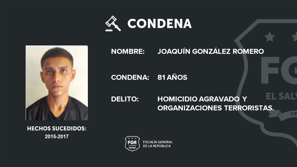 Entre los pandilleros condenados está Joaquín González Romero, alias El Chucho, con rango de homeboy, quien recibió una sentencia de  81 años de prisión por dos homicidios agravados y organizaciones terroristas. Entre los homicidios que cometió Romero está el de la maestra  María Emma Amaya de Ortez, que fue asesinada con arma de fuego el 3 de diciembre de 2015, en la colonia El Molino, de San Miguel; solo por este crimen el Tribunal le impuso 40 años de cárcel.