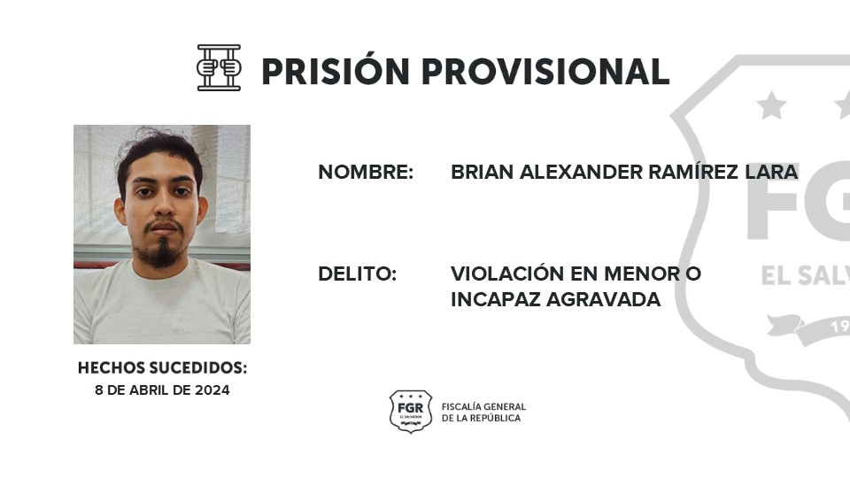 Usulután. La Fiscalía General de la República (FGR) logró que Brian Alexander Ramírez Lara se mantenga en prisión mientras siguen las investigaciones en su contra por el delito de violación en contra de un menor de ocho meses de edad.
