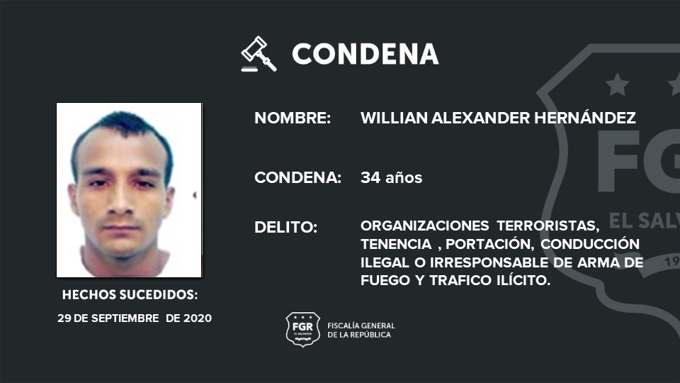 San Miguel. La Fiscalía General de la República (FGR) logró que William Alexander Hernández, alias nuevo, fuera sentenciado a 34 años de prisión por organizaciones terroristas, tenencia, portación, conducción ilegal o irresponsable de arma de fuego y tráfico ilícito.