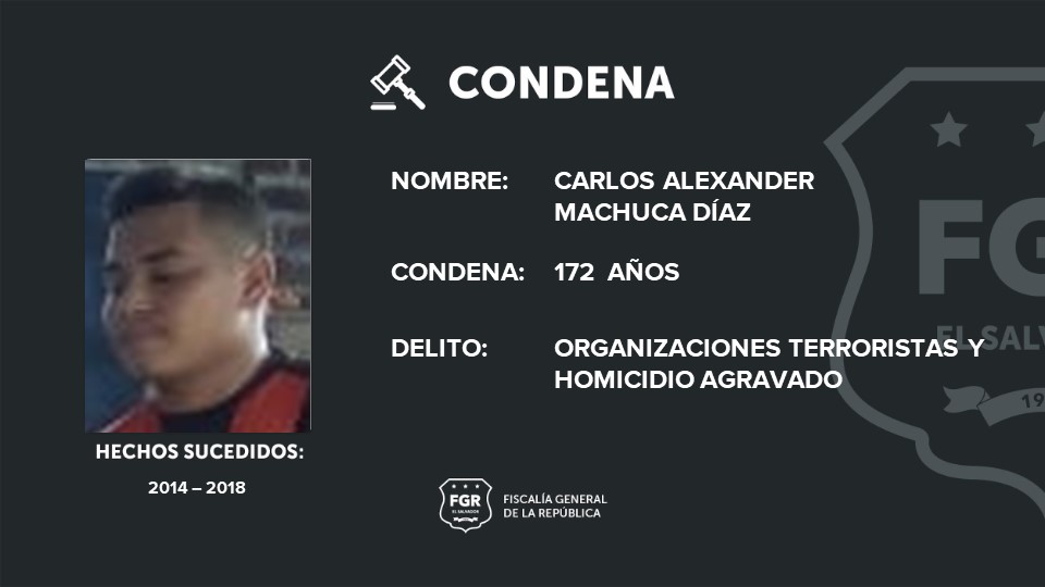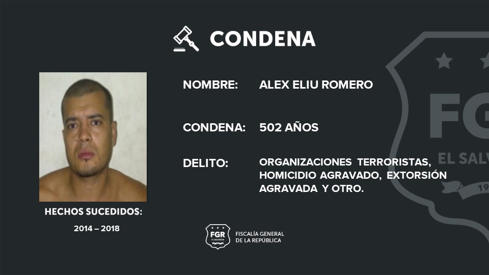 El Tribunal Segundo Contra el Crimen Organizado JB de San Miguel, dio la pena más alta de 502 años de cárcel al Alex Eliu Romero, alias terrible, por organizaciones terroristas, 6 proposición y conspiración en el delito de homicidio agravado, 8 homicidios agravados y 5 extorsiones agravadas.