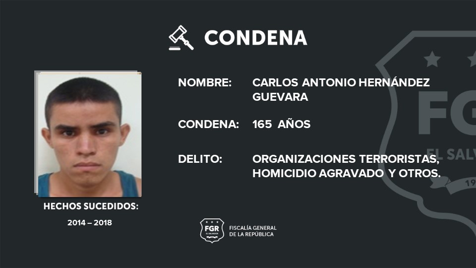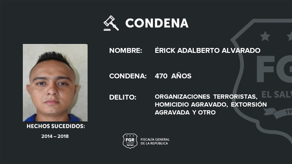 Érick Adalberto Alvarado, alias blazer, fue condenado a 470 años de cárcel por organizaciones terroristas, 3 casos de proposición y conspiración en el delito de homicidio agravado, 8 homicidios agravados, 4 extorsiones agravadas y actos preparatorios, proposición, conspiración y asociaciones delictivas en el delito de tráfico ilícito de droga con agravación especial,