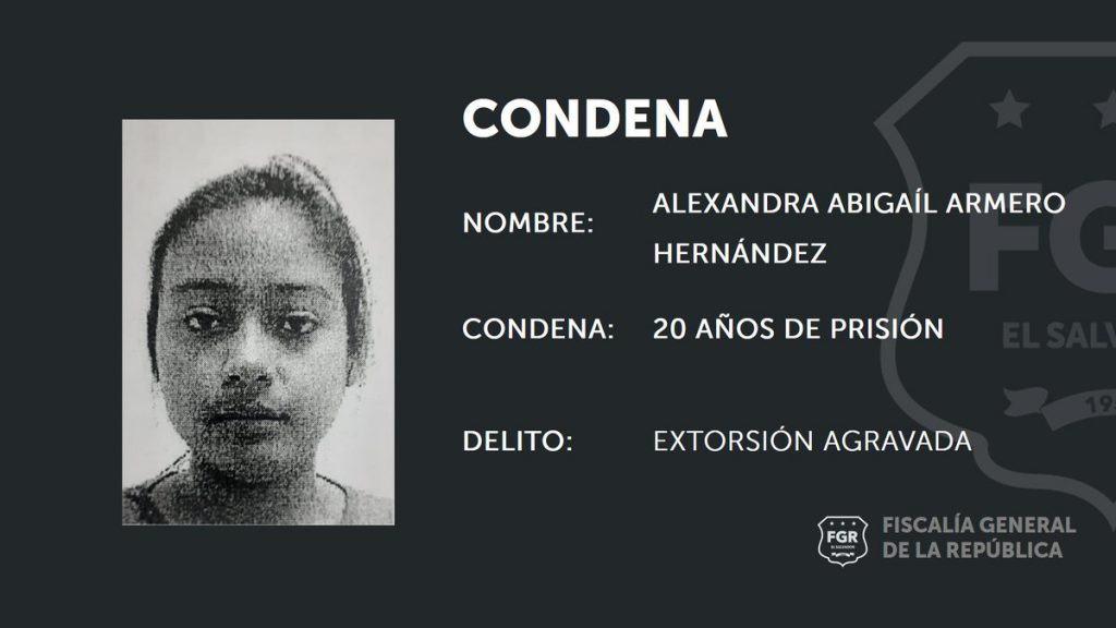La investigación debidamente fundamentada dejó como resultado ante un juez, la condena de prisión en contra de una mujer que desde el año 2017 se venía dedicando a amenazar y a cobrar el denominado pago de la renta a un empresario del municipio de Mejicanos. Por lo que son 20 años los que deberá permanecer encarcelada.