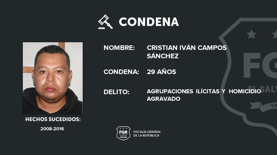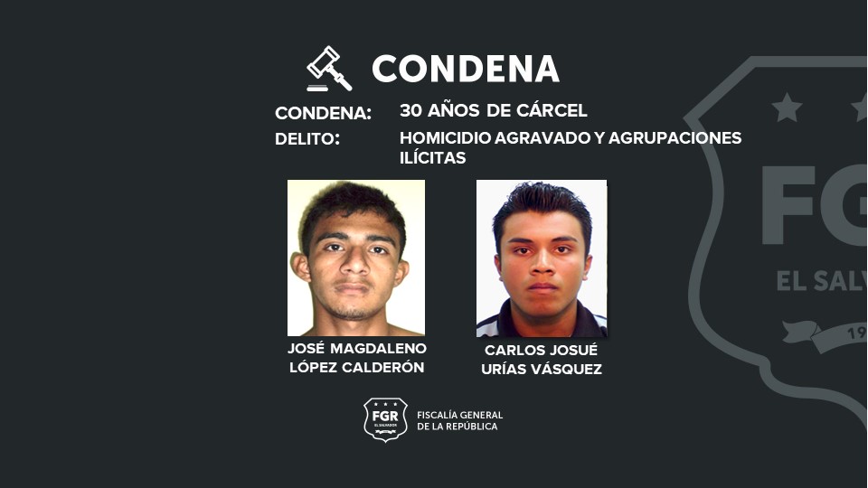 José Magdaleno López Calderón, alias jocker y Carlos Josué Urías Vásquez, alias black, fueron condenados a 30 años de cárcel por un homicidio agravado y agrupaciones ilícitas, y a 29 Cristian Iván Campos Sánchez, alias cachete, por un homicidio agravado y agrupaciones ilícitas.