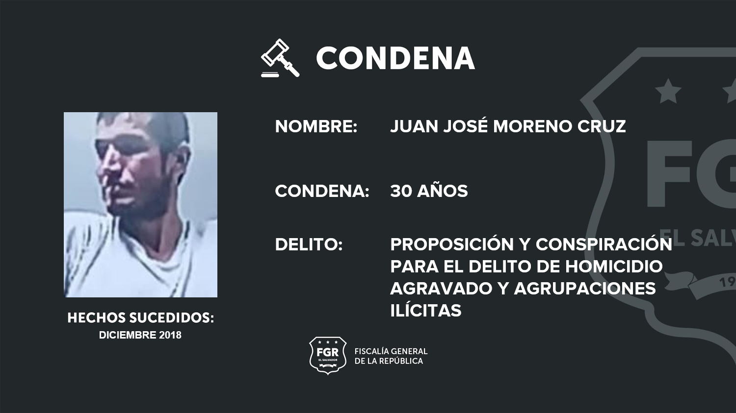FGR logra sentencia de 30 años para pandillero que planificó homicidio en Cabañas