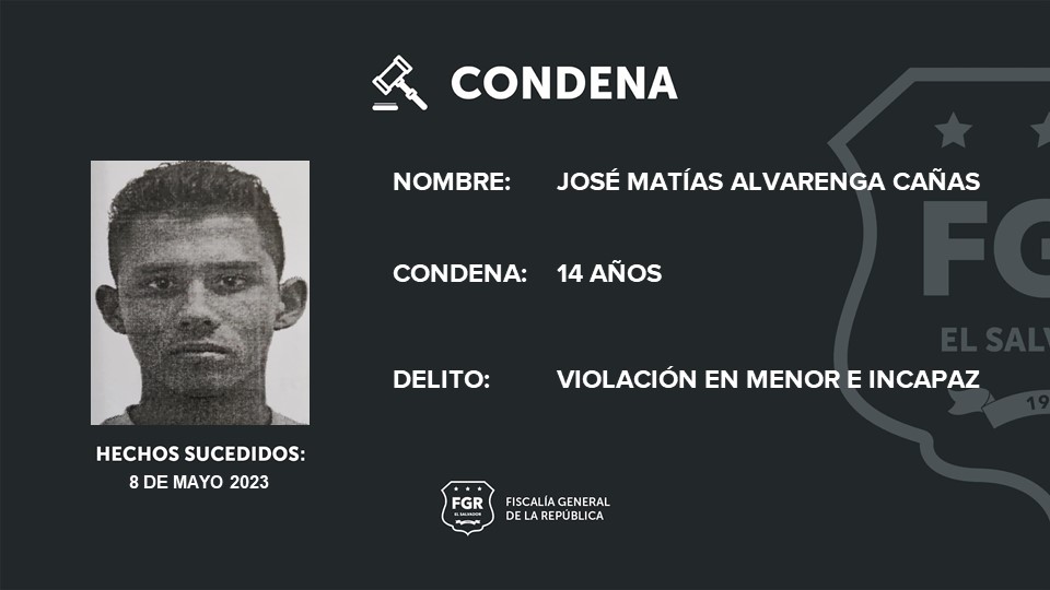Santa Tecla, La Libertad. José Matías Alvarenga Cañas fue condenado a 14 años de prisión por haber violado a una niña de 11 años de edad. La agresión fue cometida el 8 mayo del año 2023, en la jurisdicción de Quezaltepeque, La Libertad Norte.