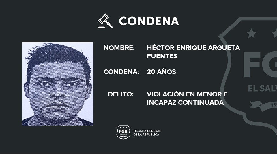 Santa Tecla. La Fiscalía General de la República (FGR) en su labor de hacer justicia, logró 20 años de cárcel para Héctor Enrique Argueta Fuentes, quien abusó sexualmente y en reiteradas ocasiones, a una niña de once años.