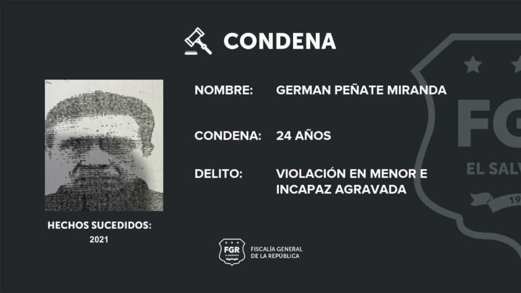 Zaragoza, La Libertad. Gracias a las abundantes pruebas presentadas en juicio, la Fiscalía General de la República (FGR) logró que Germán Peñate Miranda fuera condenado a 24 años de prisión por el delito de violación en menor e incapaz agravada.
