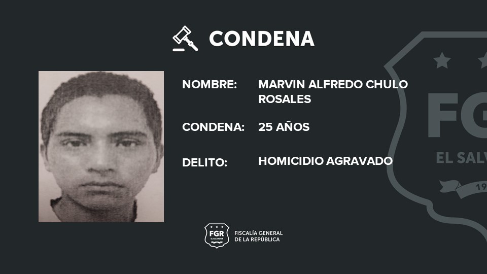 Santa Tecla. La Fiscalía General de la República (FGR) hizo justicia para una víctima que fue asesinada por Carlos Antonio Valladares Corea y Marvin Alfredo Chulo Rosales, ambos pandilleros de la MS y quienes, gracias a los elementos probatorios presentados en juicio, fueron condenados a 25 años de prisión cada uno.