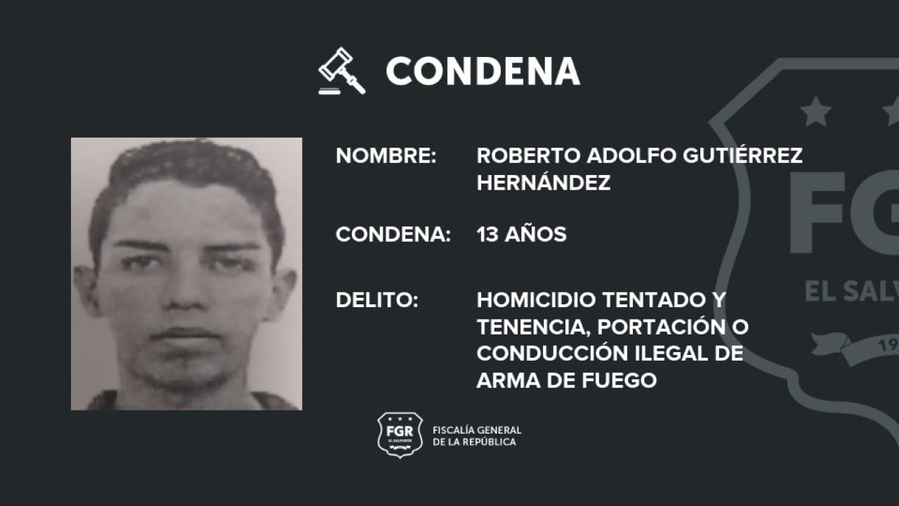 Santa Tecla. La Fiscalía General de la República (FGR) logró cárcel para Roberto Adolfo Gutiérrez Hernández, pandillero de la 18 Sureños por haber intentado asesinar con un arma de fuego a tres víctimas. El hecho ocurrió el pasado tres de mayo del año 2021 en el municipio de San Juan Opico La Libertad.