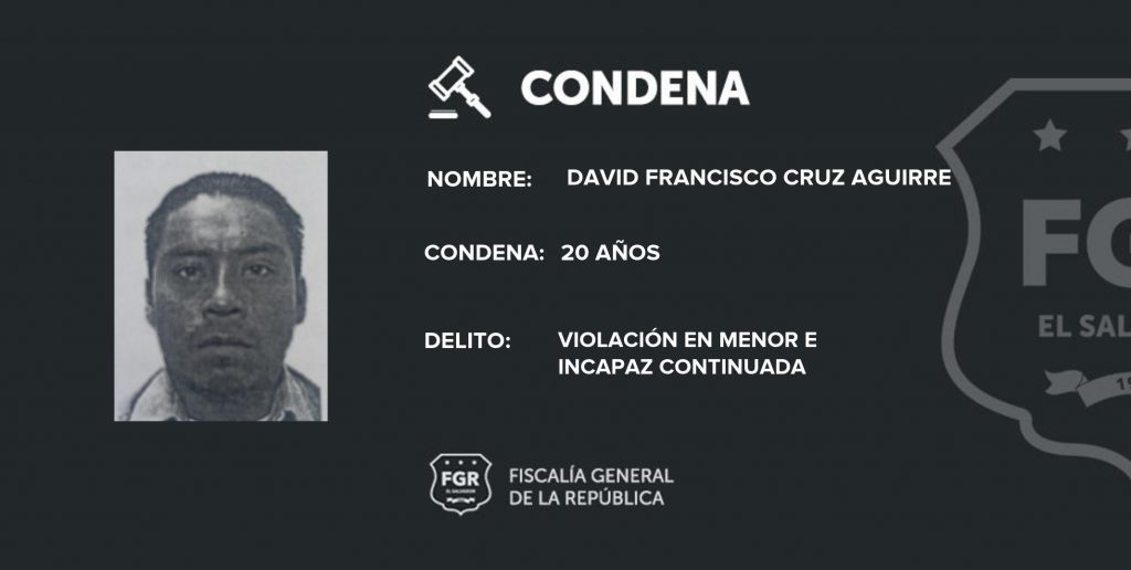La Unidad de Atención Especializada para la Mujer, la Niñez y la Adolescencia de la Oficina de Soyapango dio a conocer este día que se trata del imputado David Francisco Cruz Aguirre, de 39 años de edad, quien enfrentó la vista pública ante el Tribunal Segundo de Sentencia.