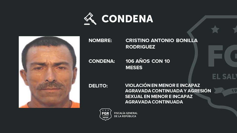 Chalatenango. La Fiscalía General de la República (FGR) logró hacer justicia para dos menores de 10 y 12 años de edad, quienes fueron violadas y agredidas sexualmente por Cristino Antonio Bonilla Rodríguez; tras las pruebas contundentes presentadas en un juicio por la institución fiscal, al imputado se le condenó a 106 años con 10 meses de cárcel.