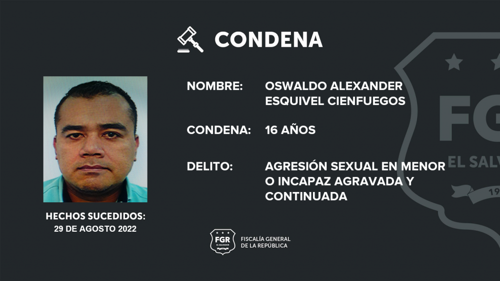 San Salvador. La Fiscalía General de la República (FGR) hizo posible la imposición de 16 años en la cárcel para Oswaldo Alexander Esquivel Cienfuegos, quien fue declarado culpable por amenazar y agredir sexualmente a una menor en la jurisdicción de Mejicanos, San Salvador Centro.