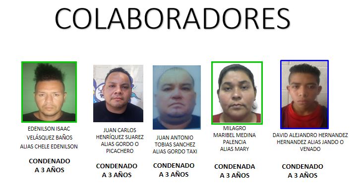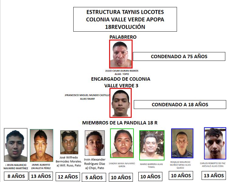 Las penas que cumplirán estos delincuentes, son las siguientes:Julio César Durán Ramos, 75 añs de cárcel al haber cometido 9 delitos; Franscico Miguel Mundo Castillo, alias «Frank», 18 años; Jaime Alberto Zavaleta Pérez, alias «Zapatón» y Carlos Roberto de Paz Arévalo, alias «Cora», 13 años; José Wilfredo Bermúdez Morales, alias «Ruso», 12 años; Sandra María Navarro Girón, «Chapina»; Mario Barrera, alias «Tamal» y Rogelio Mauricio Muñoz Mena, alias «Queco», 10 años; Irvin Mauricio Navarro Martínez, alias «Chucha», 8 años; Irvin Alexander Rodríguez Díaz, alias «Chipi», 5 años; Milagro Maribel Medina Palencia, alias «Mary»; Juan Antonio Tobías Sánchez, alias «Gordo»; Edenilson Isaac Velásquez Baños, alias «Chele»; Juan Carlos Henríquez Suárez, alias «Gordo» y David Alejandro Hernández Hernández, alias «Venado», cada uno con 3 años por ser considerados colaboradores de la estructura.