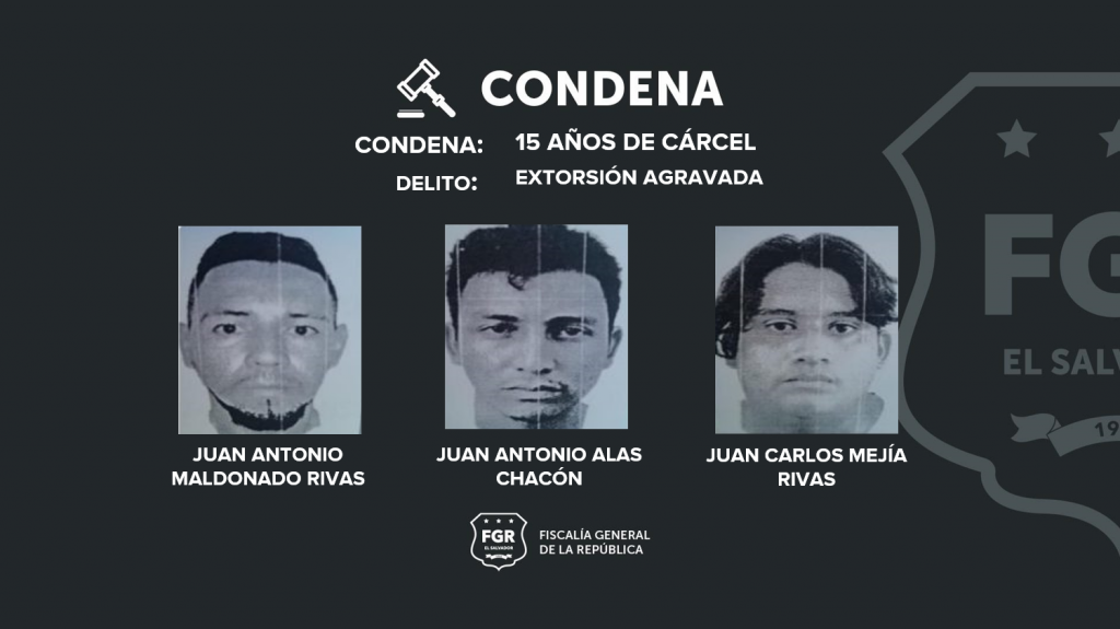 San Salvador. La Fiscalía General de la República logró que el Tribunal Primero de Sentencia de Santa Tecla declare culpables a 3 extorsionistas, y deberán cumplir penas de prisión de 15 años, esto porque son los responsables de afectar a comerciantes del municipio de Aguilares, al norte de San Salvador.