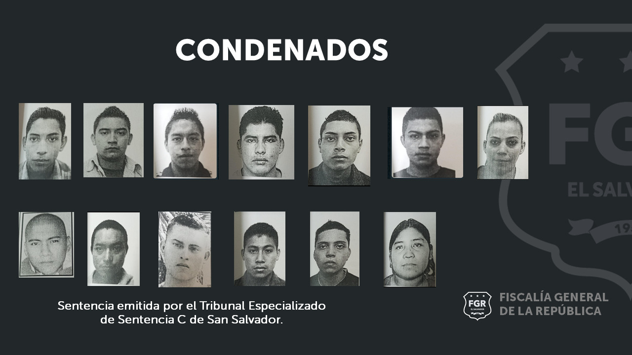 La Fiscalía General de la República dio a conocer que 13 miembros de una estructura extorsionista que operaba en diferentes puntos del municipio de Panchimalco, en San Salvador, deberán cumplir diferentes condenas de prisión, después de ser declarados culpables por diversos delitos. Las penas van hasta lo 49 años con 6 meses, otras de 20 y mínimas de 4 años.