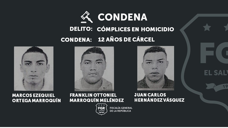 El fallo judicial señaló a José Ángel Ortega Marroquín, como autor directo del crimen, por lo que cumplirá pena de 18 años de prisión; mientras que Marcos Ezequiel Ortega Marroquín, Franklin Ottoniel Marroquín Meléndez y Juan Carlos Hernández Vásquez, fueron castigados con 12 años de prisión por ser considerados cómplices necesarios en este hecho.