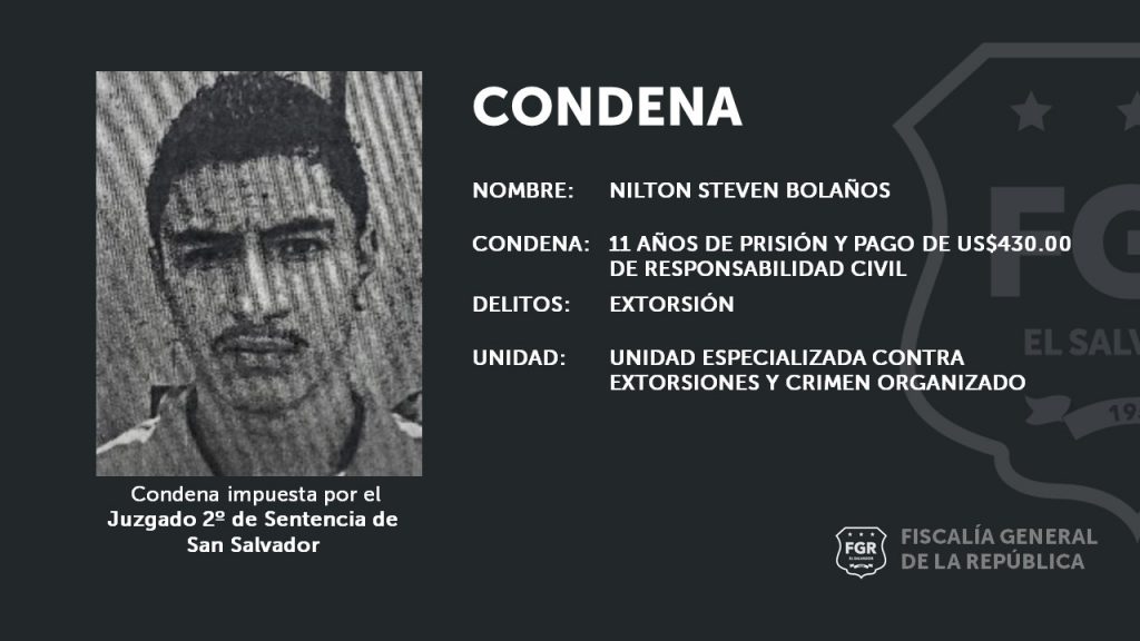 Otro juicio concluido con fallo condenatorio fue el desarrollado en el mismo Tribunal, ante el cual se logró la condena contra Nilton Steven Bolaños, a quien se le responsabilizó por el delito de Extorsión.