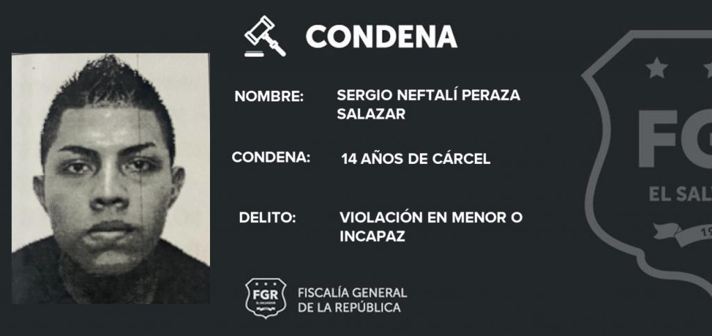 El primero de los casos fue contra Sergio Neftalí Peraza Salazar, quien fue declarado culpable por el delito de Violación en Menor o Incapaz. El Tribunal Primero de Sentencia de San Salvador admitió toda la prueba de cargo que demostró que el imputado abusó sexualmente de una adolescente al entrar en su vivienda en Residencial Alta Vista, en San Martín. El Tribunal impuso la condena de prisión de 14 años.