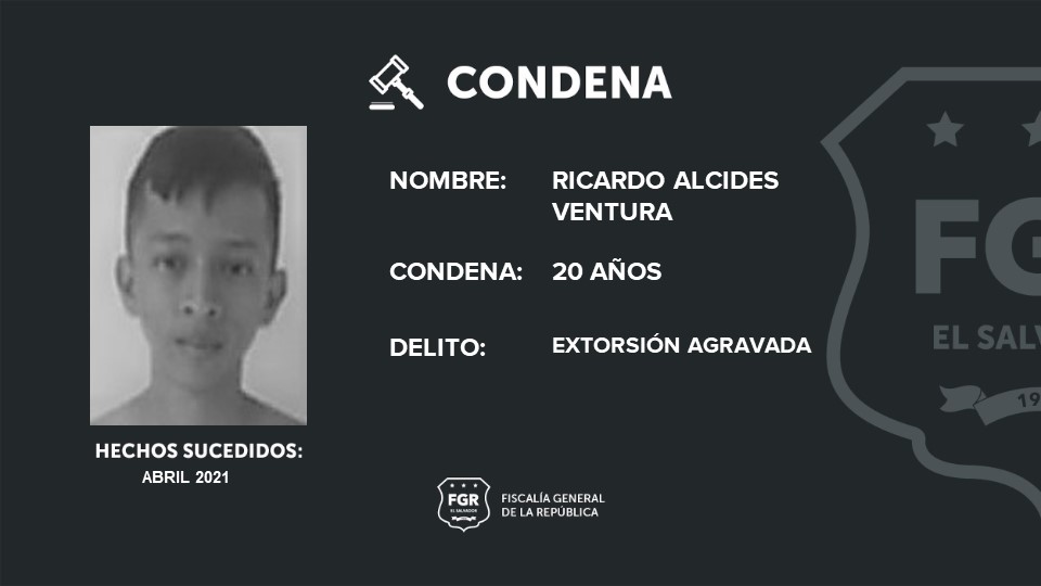 San Salvador. Brayan Alexander Vásquez Vásquez y Óscar Isaac Cornejo Ayala y Ricardo Alcides Ventura, todos miembros de la Pandilla 18 revolucionarios, de la cancha San Roque, fueron sentenciados a 40 años y 20 años de cárcel, respectivamente, por extorsión. Vásquez y Ayala tenían rango de homeboys dentro de la pandillera y Ventura era colaborador.
