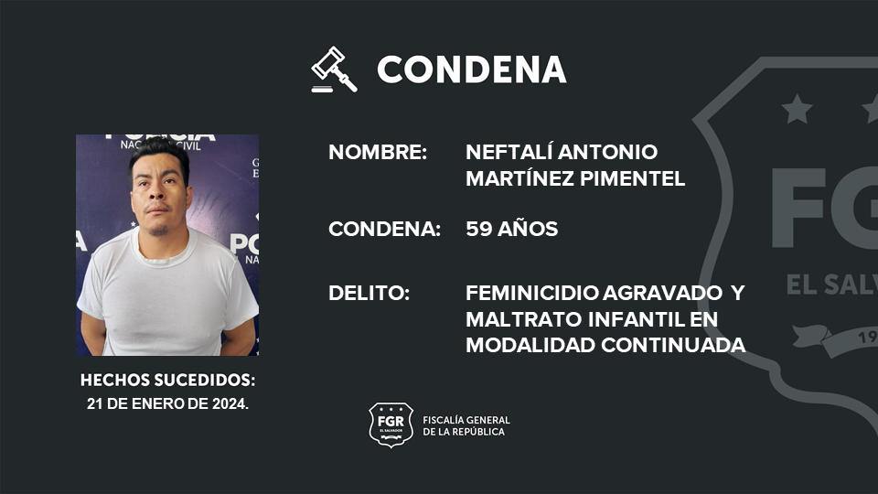 Ahuachapán Centro, Ahuachapán. La Fiscalía General de la República logró que Neftalí Antonio Martínez Pimentel fuera condenado a 59 años de prisión por los delitos de feminicidio agravado contra una menor de edad y maltrato infantil en modalidad continuada de otros tres menores.