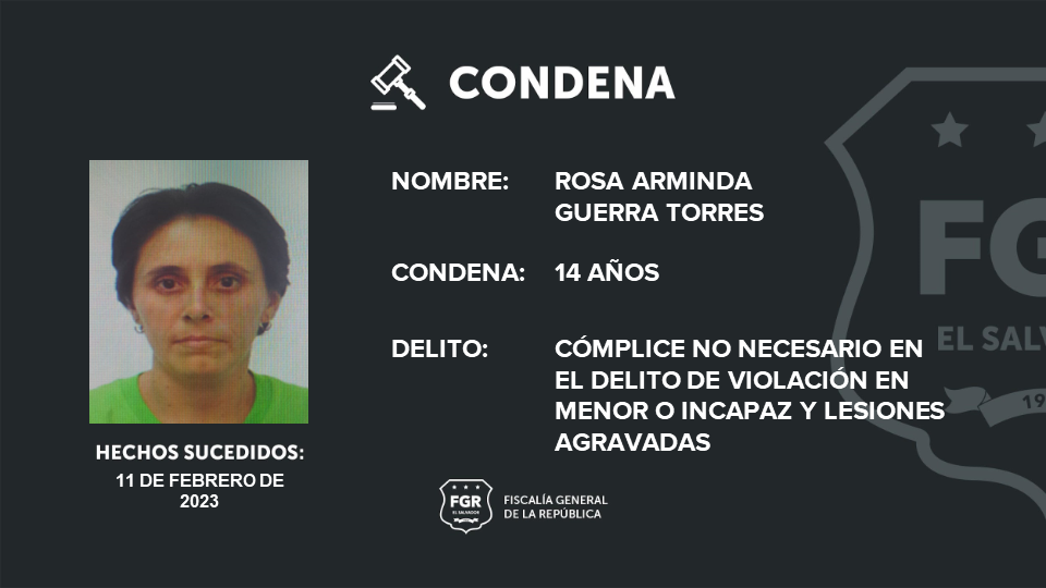 San Salvador. La Fiscalía General de la República (FGR) logró que José Cristóbal Torres Cruz fuera sentenciado a 20 años de prisión por el delito de violación en menor e incapaz agravada y también se consiguió que Rosa Arminda Guerra Torres obtuviera una condena de 14 años de cárcel por los delitos de cómplice no necesario en el delito de violación en menor o incapaz y lesiones agravadas en perjuicio de una menor de edad.