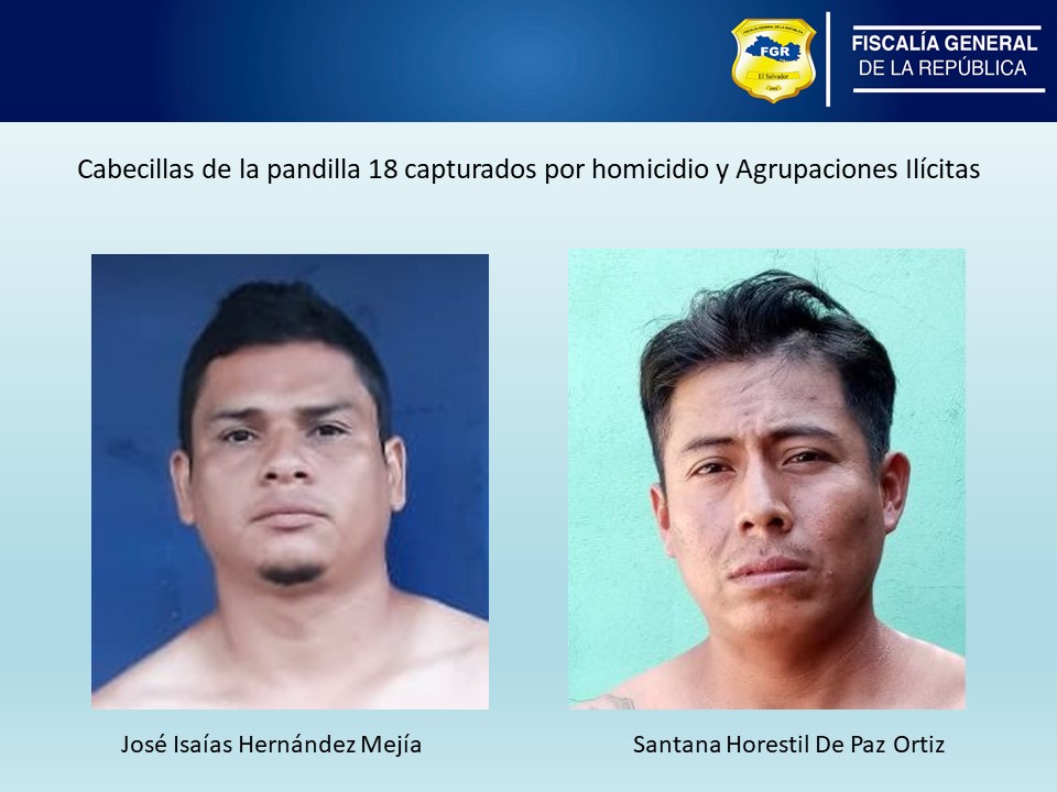 Entre las capturas están José Isaías Hernández Mejía y Santana de Paz Ortiz, cabecillas de la Pandilla 18, quienes fueron detenidos por los delitos de Homicidio Agravado y Agrupaciones Ilícitas.