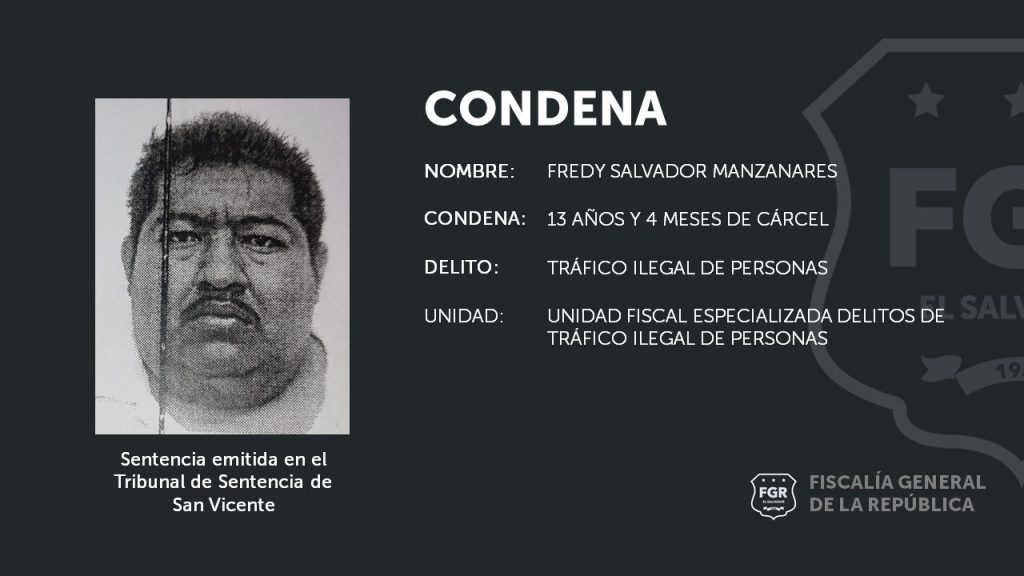 San Vicente. Fredy Salvador Manzanares, fue declarado culpable por dedicarse a trasladar personas indocumentadas hacia Los Estados Unidos de América, y la FGR logró demostrar su culpabilidad en uno de los casos que se le involucra. Ahora deberá pagar con más de 13 años en prisión.