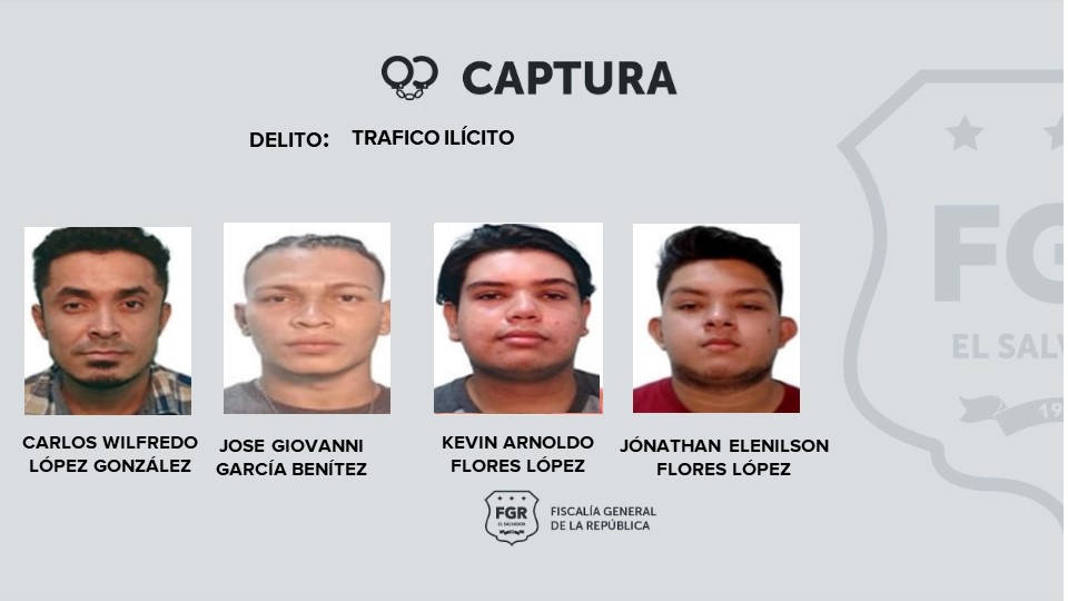 Mientras que Carlos Wilfredo López González, José Giovanni García Benítez, Kevin Arnoldo Flores López y Jónathan Elenilson Flores López fueron detenidos por tráfico ilícito.