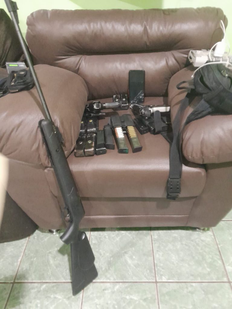 Durante los registros se incautó una ametralladora Uzi, un fusil y abundante munición, así como dos armas cortas de fuego. También, se decomisaron 4 vehículos, 11 teléfonos y $8,300 dólares en efectivo, así como dos computadoras portátiles y documentos como partidas de nacimiento que eran alteradas.
