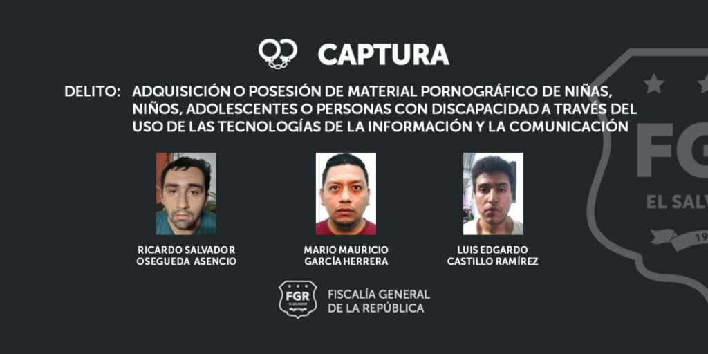 San Salvador. En un procedimiento dirigido por fiscales de la Unidad de Atención Especializada para la Mujer, Niñez y Adolescencia, de la oficina de San Salvador, y ejecutado por elementos de la Policía Nacional Civil (PNC) se logró la captura de tres sujetos vinculados con la posesión y comercialización de pornografía infantil.