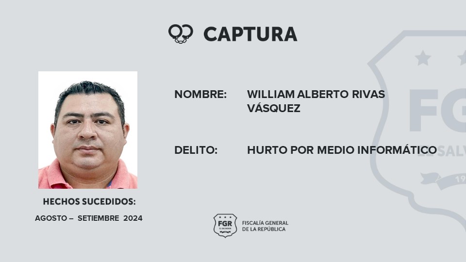 En otro caso, la FGR emitió dos órdenes administrativas contra William Alberto Rivas Vásquez por el delito de hurto por medio informáticos. El capturado es acusado de hurtar de una cuenta bancaria $5,500.