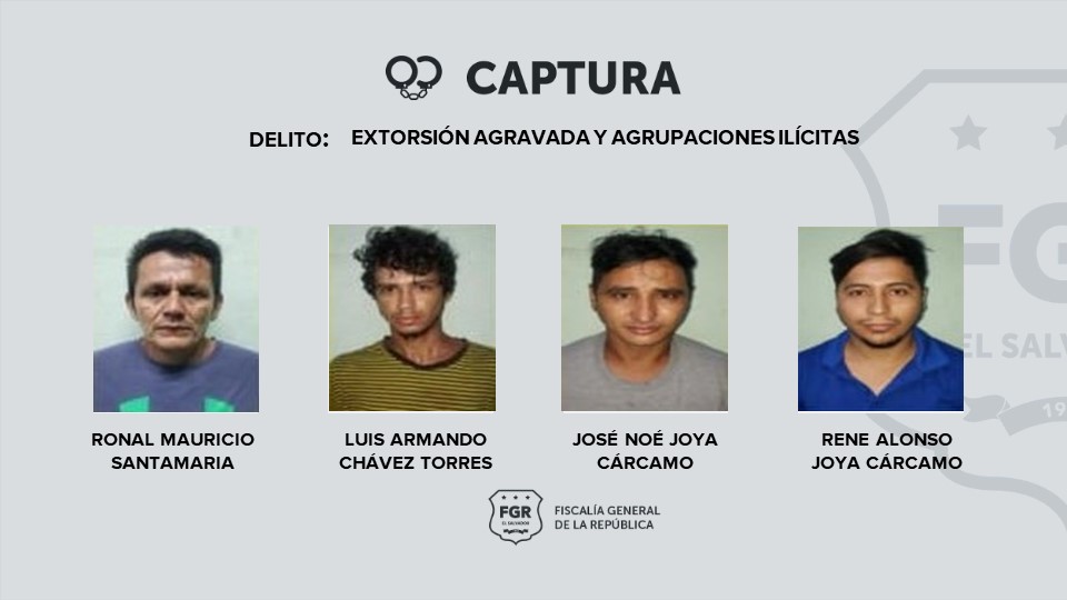 Morázan. La Fiscalía General de la República (FGR) ordenó la detención de 12 pandilleros del Programa Vía Satélite VSLS de la MS-13, que operaban en el municipio de Sociedad, Morazán. Los delincuentes serán procesados por extorsión agravada y agrupaciones ilícitas.