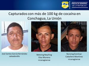 La Unión. La Fiscalía General de la República, FGR, dio a conocer las detenciones administrativas de un salvadoreño y dos nicaragüenses, a quienes se les incautó 100 kilos de cocaína en una vivienda en el municipio de Conchagua, departamento de La Unión. En un plazo menor a 72 horas serán remitidos ante un juez competente.