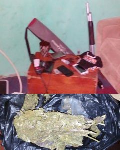 Con orden judicial, la FGR y PNC entraron al inmueble y encontraron evidencias de los delitos, entre los que se encuentran 4 vehículos de diferentes marcas y modelos, placas de vehículos, una motocicleta con alteraciones en sus registros, una escopeta y un revolver con 13 cartuchos, así como 60 gramos de marihuana.