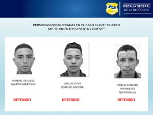 Durante la investigación se realizaron tres entregas bajo cobertura policial, donde se logró individualizar a los extorsionistas, para los cuales se giró orden de detención administrativa, las cuales se hicieron efectivas hoy contra Manuel de Jesús Saravia Martínez, Carlos Stive Romero Medina, Danilo Ernesto Hernández Quintanilla y un cuarto sujeto que aún está pendiente de capturar.