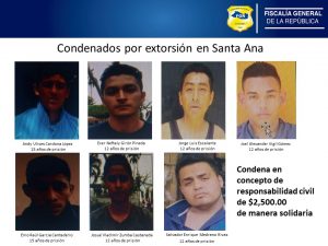 El jefe Fiscal identifico a los imputados como: Enio Raúl García Cantaderio, 15 años de prisión; Andy Ulises Cardona López, 15 años; Ever Neftaly Girón Pineda, 12 años; Josué Vladimir Zumba Castaneda, 12 años; Jorge Luis Escalante, 12 años; Salvador Enrique Medrano Rivas, 12 años, y Joel Alexander Vigil Gómez, 12 años; a quienes además deberán cancelar US$2,500.00 en concepto de responsabilidad civil de manera solidaria, por el delito de Extorsión Agravada, previsto y sancionado en el Artículo 214 del Código Penal.