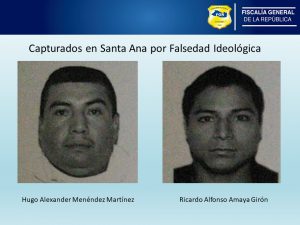 Las capturas de Hugo Alexander Menéndez Martínez y Ricardo Alfonso Amaya Girón fueron hechas efectivas ayer 16 de septiembre, por el delito penal de Falsedad Ideológica, previsto y sancionado en el artículo 284 del Código Penal, en perjuicio de la fe pública, y subsidiariamente de la señora Rosa Alicia Menéndez.