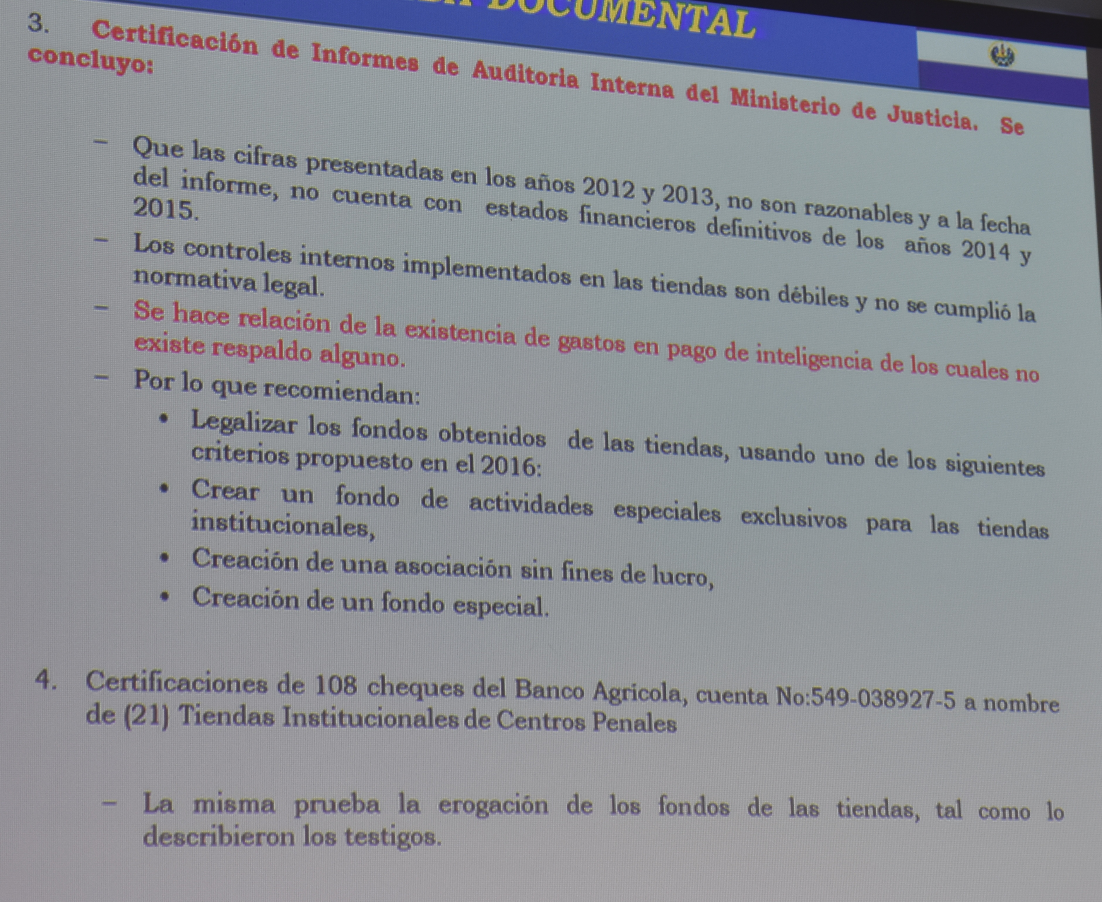 “Lo más trascendental que tenemos son las auditorías del Ministerio de Justicia que establecen un mal manejo del dinero proveniente de dichas tiendas. Es así como uno de los hallazgos es que los productos que se comerciaban en las tiendas eran elevados en sus precios a fin de garantizar las ganancias. El uso que se le dio a esos fondos fue diferente y no se mejoró el sistema carcelario”, explicó el Director Hernández.