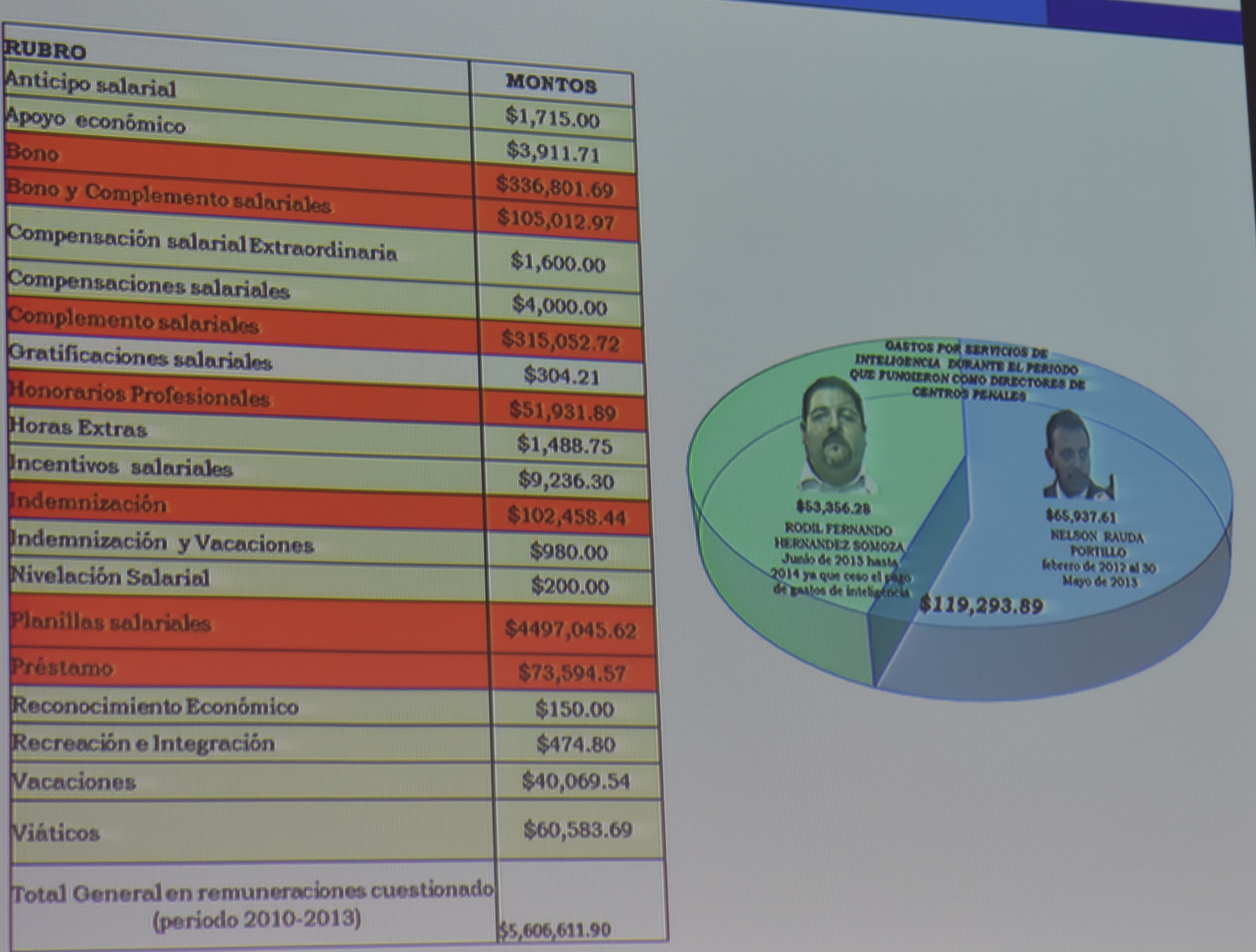 Los periodos analizados por Fiscalía se ubican entre los años 2012 al 2014, durante el cual el señor Nelson Rauda Portillo y Rodil Fernando Hernández Somoza, cuando fungieron como directores del sistema penitenciario respectivamente, ambos hicieron mal uso del dinero provenientes de las tiendas institucionales. En total, el monto cuestionado es de $5,606,611.90.