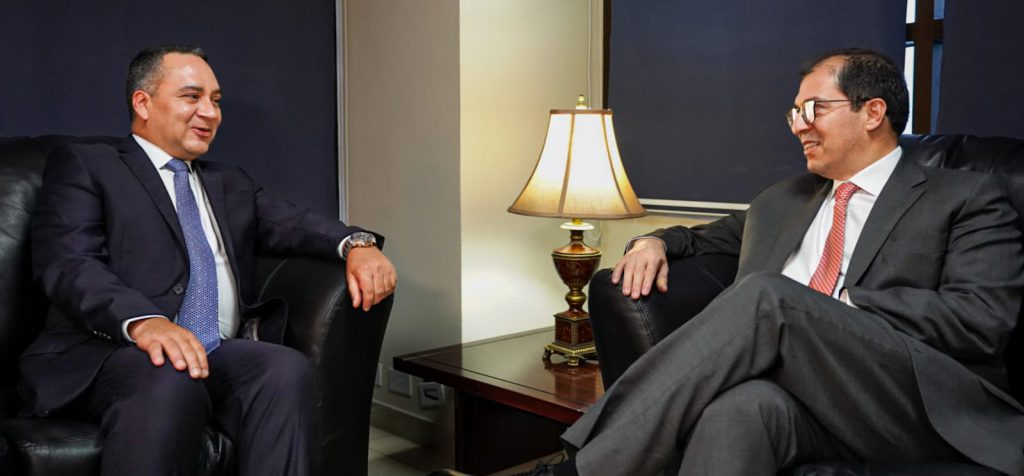 Antiguo Cuscatlán, 26 de agosto de 2022. El fiscal general de la República de El Salvador, Rodolfo Delgado, y su homólogo el fiscal general de Colombia, Francisco Barbosa, sostuvieron un encuentro en aras de abordar puntos de interés común: cooperación jurídica bilateral en la lucha contra el crimen organizado transnacional, colaboración entre ambas fiscalías y estrategia implementada para combatir grupos pandilleriles.