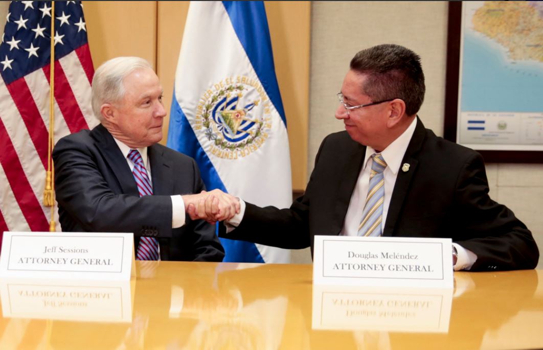 San Salvador. El Fiscal General, Douglas Meléndez y El Fiscal General de los Estados Unidos, Jeff Sessions, se reunieron esta semana en el marco de la visita del funcionario norteamericano a El Salvador, en la cual abordaron los temas de coordinación del trabajo en el combate al crimen transnacional, principalmente, la lucha contra la MS 13.