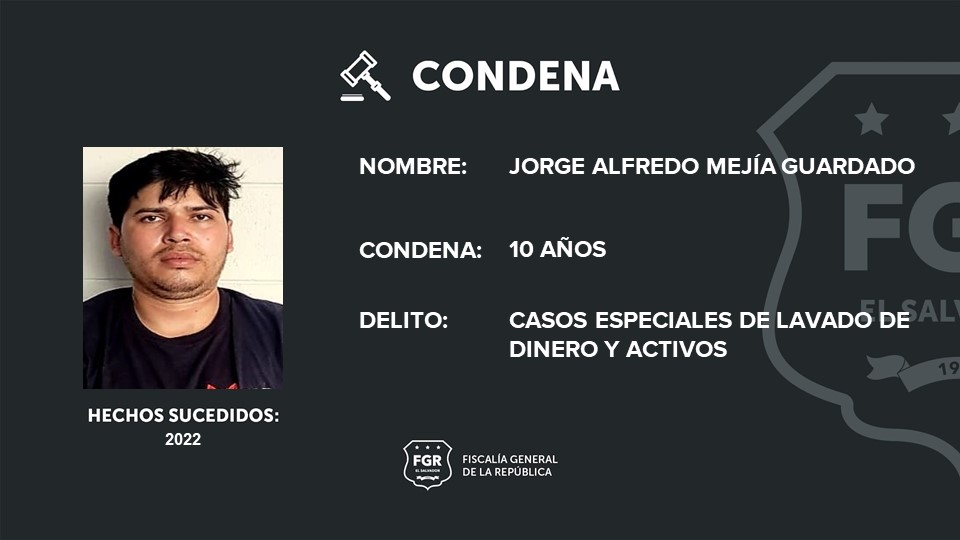 Zaragoza, La Libertad. Jorge Alfredo Mejía Guardado fue condenado a 10 años de prisión por casos especiales de lavado de dinero y activos, tras comprobar que poseía un alto patrimonio económico, el cual no pudo justificar su procedencia lícita.