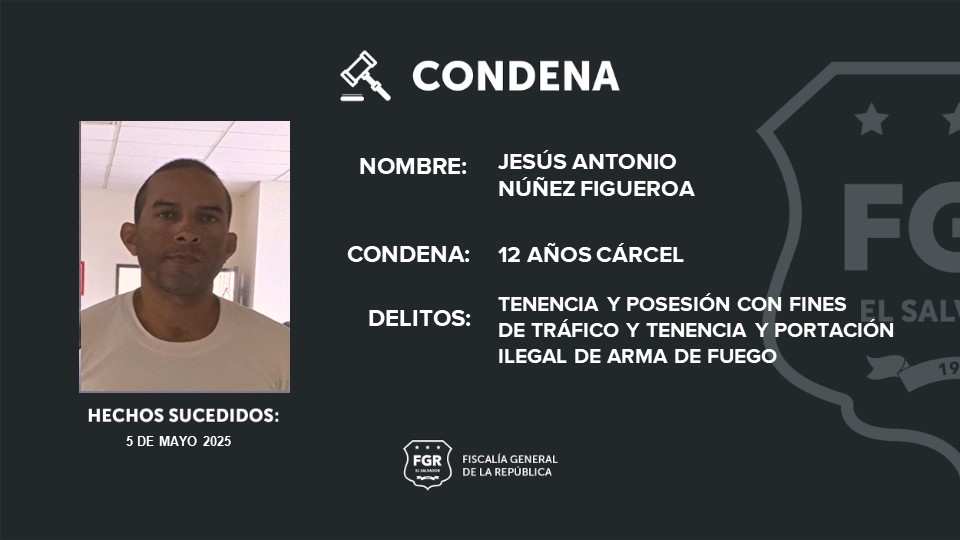 San Salvador. Una condena de prisión de 12 años deberá cumplir Jesús Antonio Núñez Figueroa, a quien la Fiscalía General de la República procesó por delitos de drogas y por tener ilegalmente un arma de fuego.