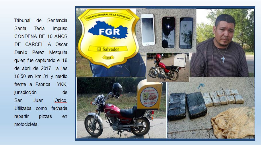 Otra condena reciente es la emitida contra Óscar Danilo Pérez Mezquita, quien purgará 10 años de prisión por habérsele capturado el 18 de abril de 2017 cuando transportaba 38 libras de marihuana por un valor de $19,695; se demostró en sede judicial que él utilizaba como fachada el servicio de reparto de pizza en motocicleta.