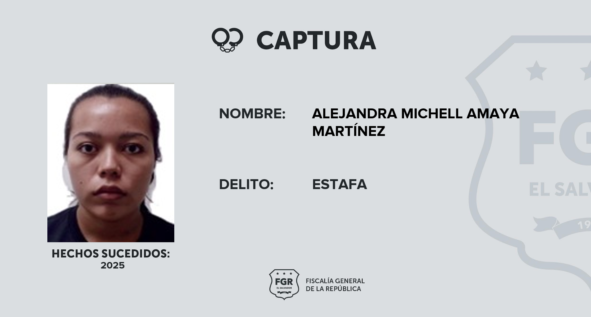 En uno de los casos, se logró la detención de Alejandra Michell Amaya Martínez, en el distrito de Soyapango, por el delito de Estafa.
