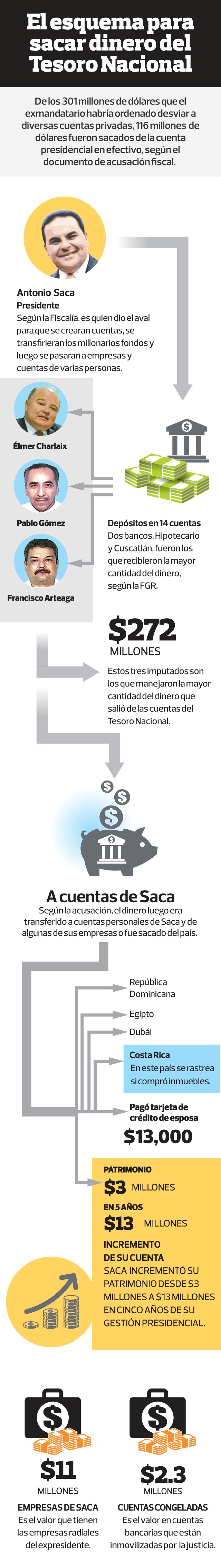 Fue el Juez Cuarto de Instrucción de San Salvador, quien el pasado 16 del corriente mes, resolvió enviar a juicio y mantener en prisión al exmandatario Elías Antonio Saca González, su exsecretario técnico,  Elmer Roberto Charlaix Urquilla;  al exsecretario de comunicaciones;  Julio Rank, al ex secretario de Juventud,  César Funes; y a los empleados de Casa Presidencial Francisco Rodríguez, Pablo Gómez y Jorge Alberto Herrera.