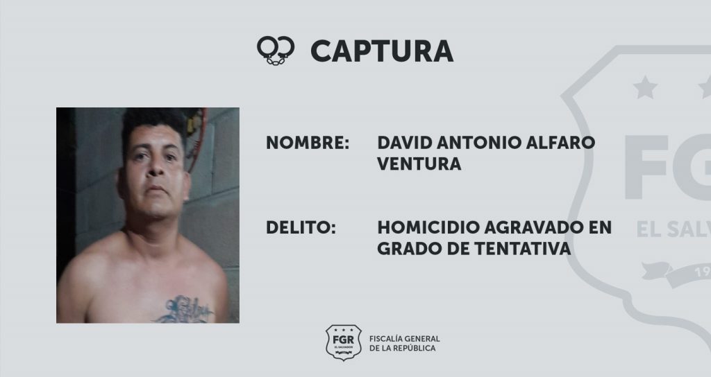 Tras el esfuerzo fiscal también fue posible capturar a David Antonio Alfaro Ventura, miembro de la Mara Salvatrucha, MS-13, por el delito de homicidio agravado en grado de tentativa (intento de Homicidio).