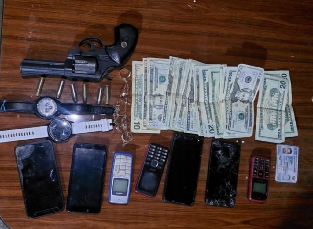 En los registros se incautaron: 1 revolver calibre 38, 6 cartuchos calibre 38, 1 gorro pasamontañas, $600 dólares en efectivo, 9 teléfonos celulares, 1 cadena, 1 pulsera y 2 relojes.