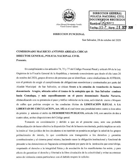 La Fiscalía le ha solicitado al director de la Policía, Mauricio Arriaza Chicas, que envíe equipos de investigadores y elabore álbum fotográfico y demás pericias de indagación, a los diferentes puntos de bloqueo para identificar a los líderes y demás participantes en los cierres que han imposibilitado la recolección de la basura en la capital.